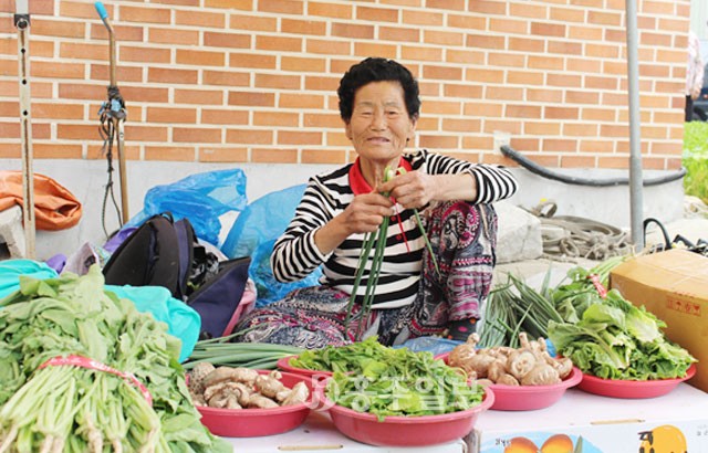▲ 갈산장에서 직접 뜯은 채소를 팔고 있는 이준선 할머니.
