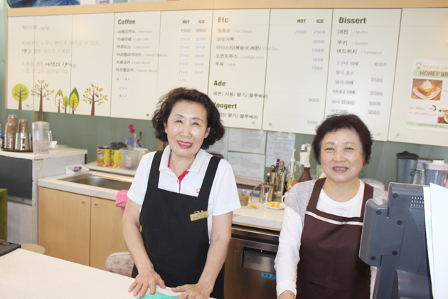 이곳에서 근무하는 어르신들은 바리스타 자격증 시험에 당당히 합격했다고 한다. 운영과 서비스 모두 어르신들이 책임지고 있지만 그럴듯한 모습으로 구색만 갖춘 카페는 아니다. 메뉴도 따뜻한 것과 시원한 것을 구분해 제법 다양하게 갖췄다. 아메리카노(HOT 1500원, ICE 2000원)와 카푸치노(2500원, 3000원), 캐러멜 마키아또(2500원, 3000원), 카페 모카(2500원, 3000원), 카라멜모카(2500원, 3000원)와 같은 인기 품목은 물론 ICE 딸기 라떼(3500원)나 바나나 라떼(3500원), 고구마라떼(4000원), 에이드-레몬, 자몽, 딸기, 블루베리(3000원), 요거트-플레인, 딸기, 불루베리(3000원), 아이스티-복숭아, 레몬(2000원), 미숫가루(3000원)등 과일을 이용한 여름 메뉴도 준비했다. 샌드위치나 빵과 같은 간단한 간식거리도 갖춰져 있다. 커피와 음료 등을 어르신들이 직접 만들어 시중가보다 20~30% 저렴한 가격에 판매한다. 운영은 매주 화~일요일 오전9시부터 오후6시까지다.