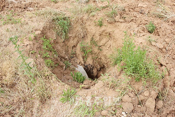【금마】금마면의 한 밭에서 싱크홀이 발생해 면이 대책 마련에 나섰다. 홍성농업기술센터 북부지구 농민상담소 앞 밭(금마면 425-2)에서 농사를 짓고 있는 이효성 씨는 지난 23일 “수년 전에 싱크홀이 발생해 몇 차례 민원을 제기했음에도 불구, 아직도 해결이 되지 않고 있다”며 답답함을 토로했다.