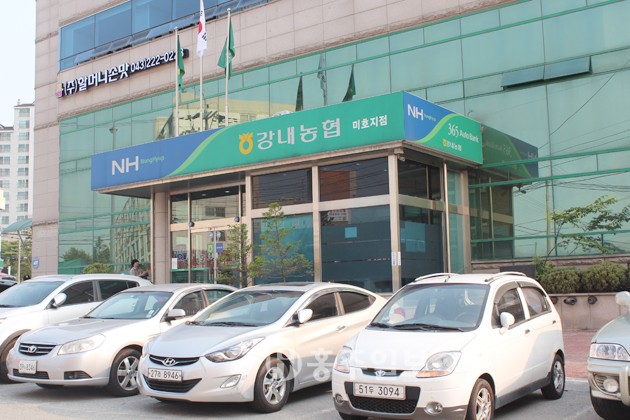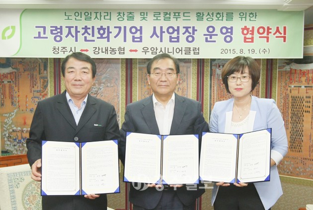 ▲ (주)할머니손맛이 소재한 청주 흥덕구의 강내농협 미호지점. 사진 아래는 청주시가 2015년 8월 강내농협(조합장 조방형), 우암시니어클럽(관장 김현숙)과 함께 ‘고령자친화기업 사업장 운영’ 협약을 했다. 협약은 강내농협에서 미호지점 3층(452.08㎡)을 고령자친화기업 사업장으로 무상 임대함에 따라 이뤄졌으며, 사업장 임대는 물론 고령자친화기업에 강내농협 조합원인 노인인재 우선 고용, 강내농협 로컬푸드를 이용한 식자재 사용 등 노인인력 활용 및 농업경쟁력 강화의 내용이 담겨있다.