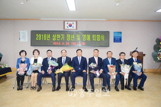 ▲ 홍성군은 지난 28일 2016년 상반기 정년 및 명예 퇴임식을 갖고 30여년간 함께 한 동료 직원들에 대한 석별의 정을 나누는 시간을 가졌다. 저작권자 © 홍주일보 무단전재 및 재배포 금지 홍주일보 다른기사 보기 페이스북 카카오톡 URL복사 기사공유하기