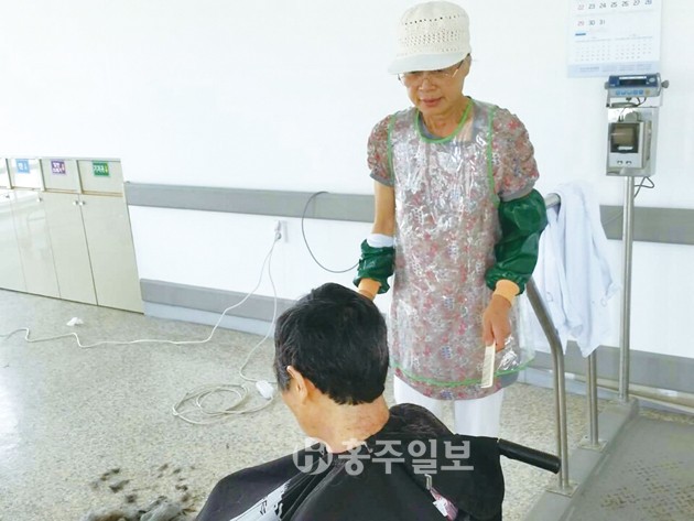 ▲ 홍성군여성자원봉사회는 지난 1일 홍성의료원 노인병동과 주간보호센터를 방문해 몸이 불편한 어르신들 이미용 봉사활동을 진행했다.