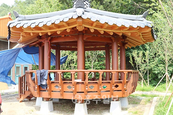 송정마을은 창조적 마을 가꾸기 사업을 통해 현재 5억원의 예산을 투입, 마을 진입로부터 회관까지 인도 공사는 마을회관 태양열 설치와 뒷산을 중심으로 한 산책로 정비, 마을 정자 설치 등이 진행 중이다. 정자의 경우 회관 앞과 윗마을 각각 한 개 씩 두 개가 설치됐는데, 지난 3일에는 마을 주민들이 회관 앞에 모여 정자 설치를 축하하는 준공식과 더불어 잔치를 벌였다. 마을 주민들은 돼지 바비큐와 떡을 준비해 함께 즐거움을 나누는 시간을 가졌다.