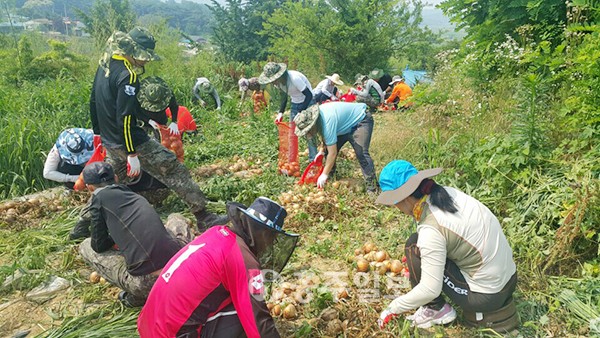 등줄기에 땀이 비 오듯 흐르는 무더운 날씨에도 농가에 도움을 주기 위한 손길은 분주히 움직였고, 참여한 모든 이들은 3300㎡ 밭에서 양파를 수확했다.