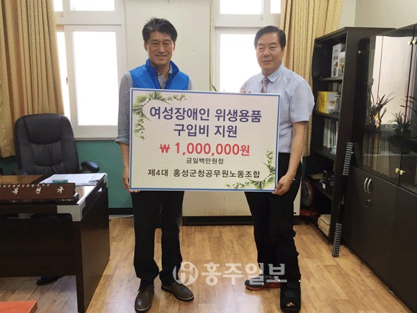 홍성군장애인종합복지관(관장 복천규)은 지난 18일 제4대 홍성군청공무원노동조합(위원장 이순광)으로부터 관내 여성장애인 위생용품 구입비 100만원을 후원받았다.