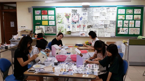 이번 예술캠프는 전학년 중 희망자 7팀의 부모와 자녀를 대상으로 개설해 본교 미술교사가 미술 실습실에서 다양한 프로그램을 진행하고 있다. 학부모와 함께하는 예술캠프 첫날에는 냅킨 아트로 생활용품 만들기 등이 진행됐으며, 아크릴화로 일러스트 그리기, 핸디페인팅으로 생활자기 그리기 등 미술관련 다양한 영역의 작품제작활동이 계획돼 있다.