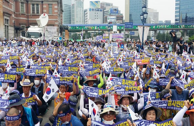 지난 21일에는 성주군민 2천여명이 50여대의 대형버스에 나눠 타고 아침 일찍 성주를 출발해 서울역 광장에서 대대적인 항의집회를 가졌다. 오후 2시경부터 시작된 집회는 30도가 넘는 폭염 속에서도 ‘사드배치 결사반대’ 구호를 제창하며 군민들은 한 마음, 한 뜻으로 뭉쳤다. 새누리당의 상징인 빨간색을 거부하며 현수막과 머리띠는 모두 파란색으로 바뀌었다.