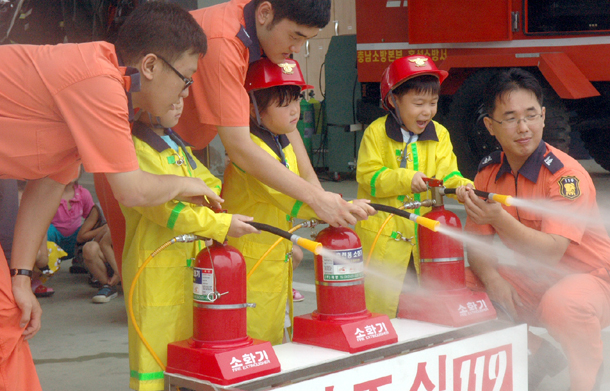 또한 소방서는 어린이들에게 소방안전에 대한 중요성과 화재에 대한 경각심을 심어주고자 차고 앞 광장에서 소화기 사용 실습과 소방차 방수 및 구조장비 소개 등 다채로운 체험 프로그램을 운영했다.