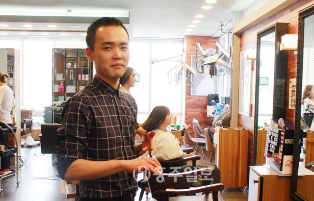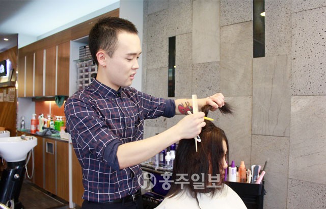 ▲ 이근호 헤어디자이너가 손님 머리카락을 손질하고 있다.