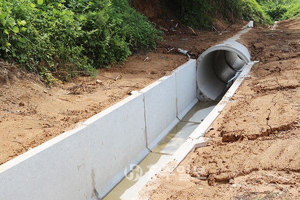 ▲ 지난 1일 마사마을 배수로 공사 현장에서 흉관이 매립돼 있는 모습.