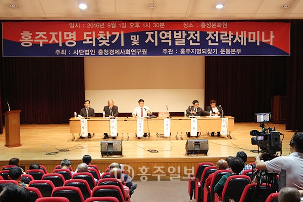 사단법인 충청경제사회연구원이 주최하고 홍주지명되찾기 범군민운동본부(본부장 오석범)가 주관하는 ‘홍주지명 되찾기 및 지역발전전략 세미나’가 지난 1일 홍성문화원 대강당에서 개최됐다. <사진>