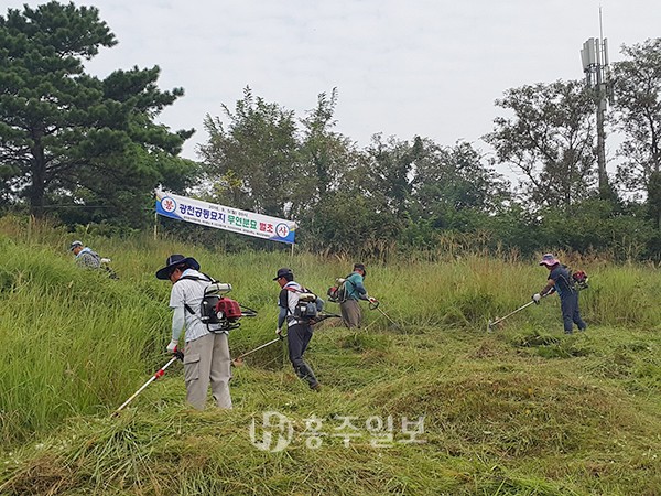 또한 광천읍이장협의회(회장 이경열), 광천읍 새마을남녀지도자회(회장 김욱환, 김양순), 광천읍 주민자치위원회(위원장 이용은) 회원 등 150여명도 옹암 공동묘지에서 고유의 명절인 추석을 앞두고 후손들이 돌보지 못하는 무연분묘 500기에 대한 벌초 작업을 실시했다.<사진>