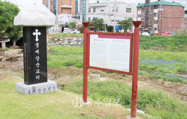 ‘천주교 홍주순교성지’비가 세워진 곳은 홍주성 북문 밖을 흐르는 월계천과 조양문 밖을 흐르는 지금의 홍성천이 만나는 합수머리 지점으로 1868년 생매장으로 순교한 최법상 베드로, 김조이 루치아, 김조이 마리아, 원 아나타시아 등을 비롯해 박해시대 홍주성 안에서 옥사나 교수형으로 순교한 순교자들의 시신이 매장된 곳으로 추정되는 장소다. 홍주 순교자들의 순교 형식은 오직 교회의 순교자 증언록을 통해서만 알 수 있는데, ‘홍주·해미성지 자료집’에 따르면 생매장 4명, 참수 2명, 미상 8명 등으로 나타난다. 1868년 유 마르타의 순교는 참수형인지 혹은 교수형인지는 명확치 않다. 1868년 5월에는 홍주 원머리 출신의 신자들 4명이 천주교 신앙 때문에 동시에 생매장되었으며, 최대 생매장 순교자는 9명으로 추정된다. 이처럼 홍주 순교자들은 참수형보다는 교수형이나 갖가지 남형으로 순교했다. 또 1868년 5월 최법상 베드로, 김조이 루치아, 김조이 마리아, 원 아나스타시아를 비롯한 생매장 추정자 최대 9명이 순교한 생매장터의 정확한 위치는 지금까지 확인되지 않고 있다.