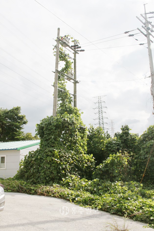 ▲ 정전사고의 주범인 칡넝쿨이 7000V를 초과하는 특고압 전류가 흐르는 전신주 주변 전선줄을 감싸고 있어 감전 위험이 있음에도 방치되고 있어 한국전력공사 홍성지사의 고압전주 전선줄 관리부실이 여실히 드러나 있다. 사진은 구항면 내현리에 특고압 전력선이 지나고 있는 전신주 주변 전선과 전선줄을 잡초 및 칡넝쿨이 감싸고 있는 모습. 저작권자 © 홍주일보 무단전재 및 재배포 금지 이은주 기자 다른기사 보기 페이스북 카카오톡 URL복사 기사공유하기