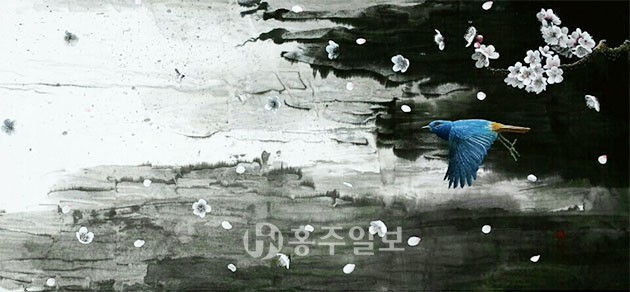 희망의 파랑새를 그리는 이헌용 한국화 작가의 4번째 전시 ‘파랑새, 희망을 노래하다’가 지난 8일부터 오는 16일까지 아산의 모네갤러리에서 열린다. 10여년 넘게 한지 위에 먹과 채색으로 파랑새를 표현한 이헌용 작가는 파랑새는 희망이며 멀리 있는 존재가 아닌 가까이 있다는 의미를 전달한다. 대표작 ‘파랑새의 산책’은 매화가 흩날리는 공간 속에 한 마리의 파랑새가 힘차게 날개짓하며 날아가는 작품으로 희망을 향한 몸짓을 보여준다.