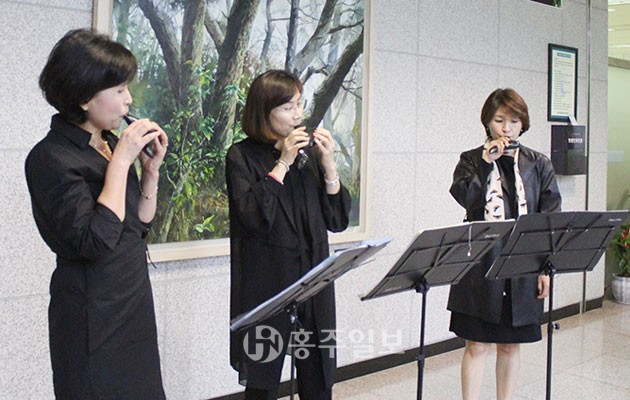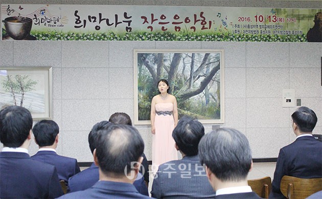 홍성지역 범죄피해자 지원센터(이사장 최헌숙)는 지난 13일 홍성법원 내에 위치한 희망카페에서 ‘희망나눔 작은 음악회’를 진행했다.<사진> 음악회는 범죄 피해자들의 상처받은 마음을 어루만지고 심리적인 안정을 위해 개최하게 됐다. 오후 5시에 시작한 음악회는 법원 내 아름다운 선율로 가득 채워 직원은 물론 법원을 찾은 민원인들의 발길을 붙잡았다.