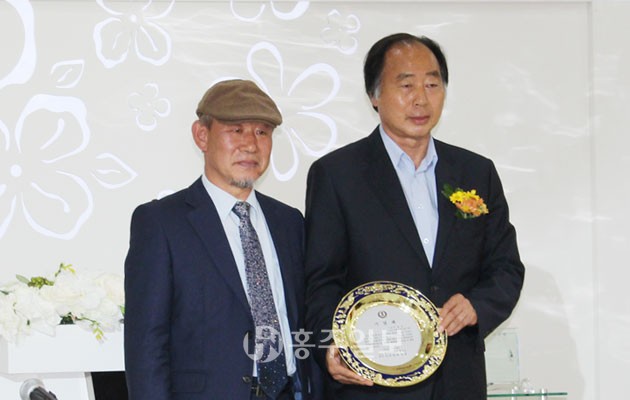 ▲ 김재천(우) 시인의 첫 시집 '그리고 남아있는 것은' 출판 기념회에서 김 시인이 기념패를 들고 있다.