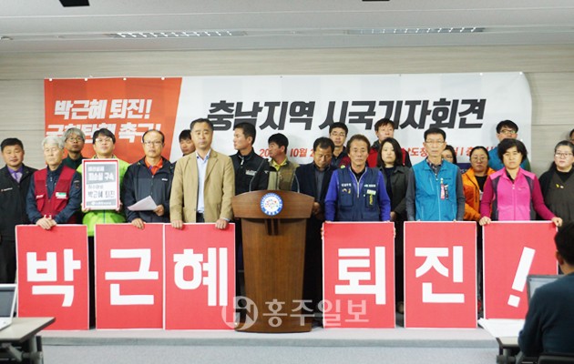 ‘최순실 게이트’와 관련해 박근혜 정권의 퇴진을 요구하는 목소리가 전국적으로 확산되고 있는 가운데 충남에서도 시국선언이 이뤄졌다. 홍성문화연대 등 충남지역 74개 시민사회단체들은 지난 달 27일 충남도청에서 기자회견을 열고 박근혜 정권 퇴진 및 국회 탄핵을 촉구하는 시국선언문을 발표했다.