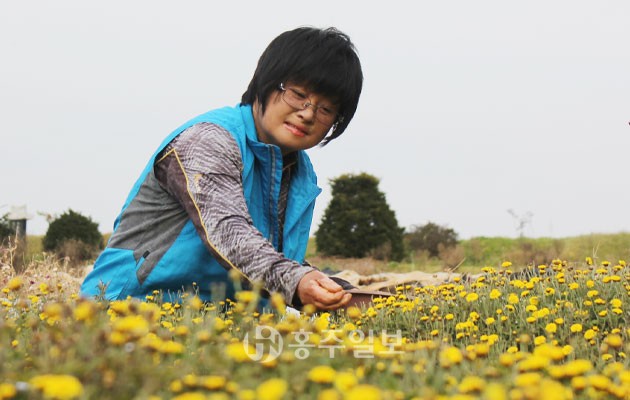 ▲ 박영분 꽃피울리나 대표가 동국꽃을 따고 있다.