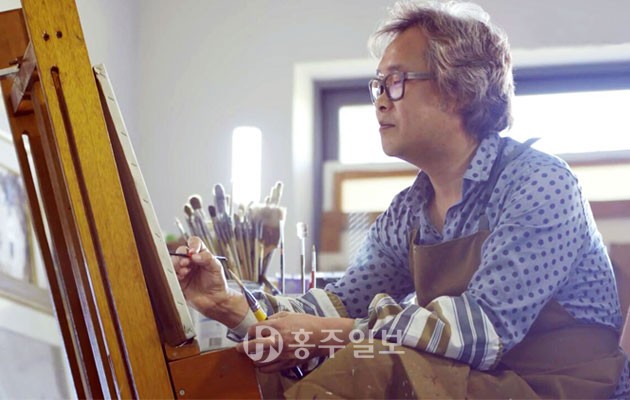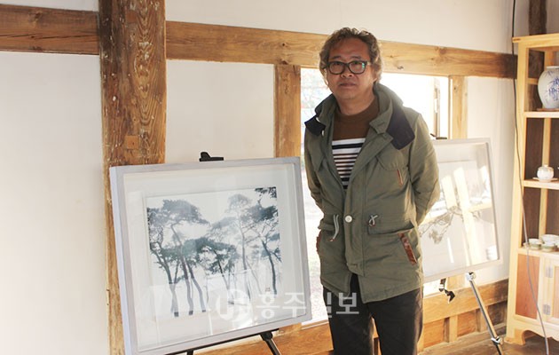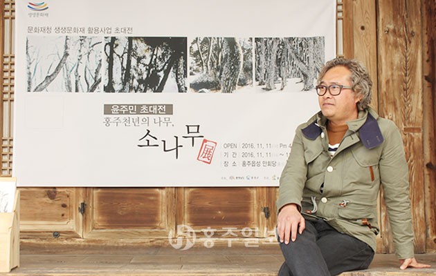 지난 11일부터 15일까지 홍성군청 후정의 안회당에서 서양화가이자 한국미협 충남지회장인 윤주민(52) 작가의 ‘홍주천년의 나무, 소나무’ 전이 열렸다. 조선 숙종 때 처음 지어진 고즈넉한 목조 기와집인 안회당 내부는 나무숨결이 그대로 전해지는 곳이다. 그의 소나무 작품이 안회당의 일부인 듯 전체가 한 폭의 그림처럼 어우러졌다. 작품은 얼핏 보기에 먹으로 그린 수묵화 인듯 보였으나 자세히 보니 캔버스에 유화나 아크릭으로 그린 서양화였다. 그림에는 한국화처럼 붉은 낙관이 찍힌 작품도 있었다. 서양의 재료로 한국의 정신을 표현하는 윤주민 작가를 지난 15일 전시가 열리는 안회당에서 만났다.