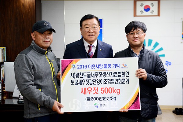 【광천】사단법인 광천토굴새우젓생산자연합회 및 토굴새우젓광천영어조합법인 회원 등 새우젓가게를 운영하는 회원들은 지난 10일 군수실을 방문해 새우젓 500kg(총 600만원 상당)을 홍성군에 기부했다.<사진>