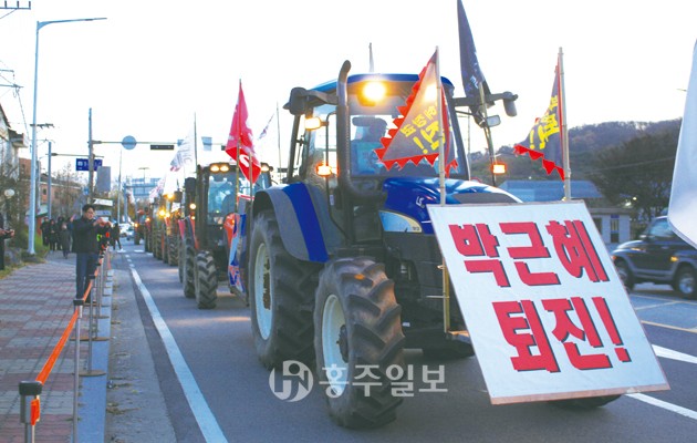 농기계를 끌고 청와대로 향하고 있는 농민들이 홍성에 도착해 박근혜 대통령의 퇴진을 촉구하는 촛불집회를 열었다. 전국농민회총연맹과 전국여성농민회총연합은 지난 15일 ‘쌀값 대폭락, 백남기 농민 폭력살인, 농정파탄, 국정농단, 범죄자 박근혜 퇴진 농민선언문’을 채택하고 농기계 상경투쟁을 시작했다. 농민들은 동군과 서군으로 나뉘어 경남에서 출발하는 동군과 전남에서 출발하는 서군으로 나눠 행진을 진행 중이다.