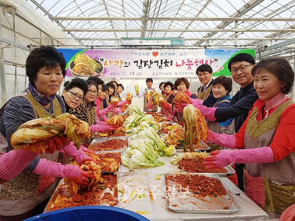 농협 홍성군지부(지부장 이범구)는 지난 18일 서부농협 육묘장에서 ‘우리농산물로 나누는 이웃사랑 캠페인! 사랑의 김장김치 나눔!’ 행사를 개최했다.<사진>