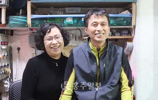 ▲ 서문탕을 운영하는 이순희, 이광섭 대표 부부가 카운터에 앉아 환하게 웃고 있다.