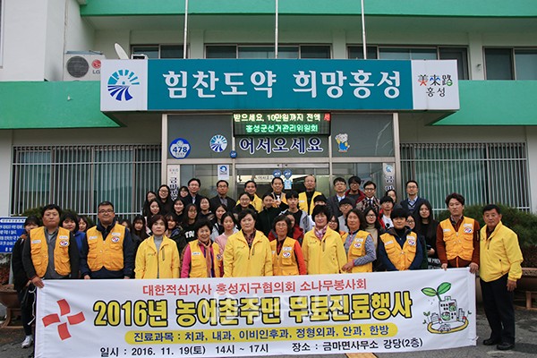 【금마】‘2016년 농어촌 주민 무료 진료 행사’가 지난 19일, 금마면사무소 2층에서 실시됐다. 이날 행사는 대한적십자사봉사회 홍성지구협의회 소나무봉사회(회장 박관양)의 주관으로 개최됐다.<사진>