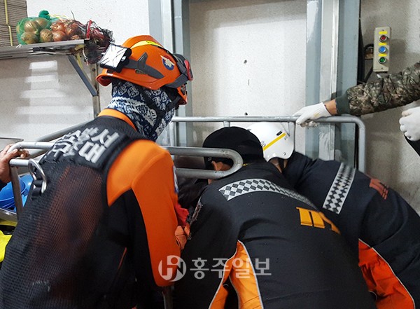 지난 18일 오후 6시경 홍성읍 오관리 소재 상가에서 간이승강기가 층과 층 사이에 멈췄다는 신고를 접수받고 홍성소방서 119구조대는 신속하게 현장으로 출동했다. 현장 도착 후 구조대원은 내부에 있는 요구조자와 대화를 통해 안심시킨 후, 즉시 구조 활동을 펼쳐 간이승강기에 갇혀 있던 고모씨(70)를 안전하게 구조했다.