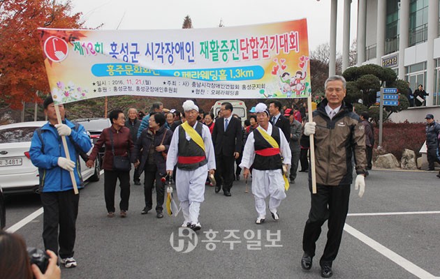 (사)충남시각장애인연합회 홍성군지회(지회장 김응열)는 지난 21일 홍주문화회관에서 오페라웨딩홀까지 약 1.3km 구간을 걷는 재활증진단합걷기대회를 진행했다.<사진>