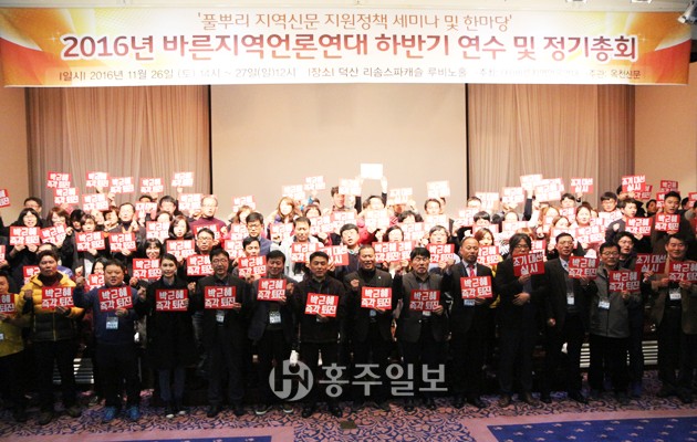 바른지역언론연대(회장 이안재 옥천신문 대표) 소속 언론인들이 한자리에 모여 '박근혜 퇴진'을 외쳤다. 전국 34개 풀뿌리 지역신문의 연대모임인 바른지역연대 소속 언론인 200여명은 26일 오후 5시 충남 덕산리솜스파캐슬 강당에서 열린 연수회 자리에서 비상 시국선언문을 발표했다.