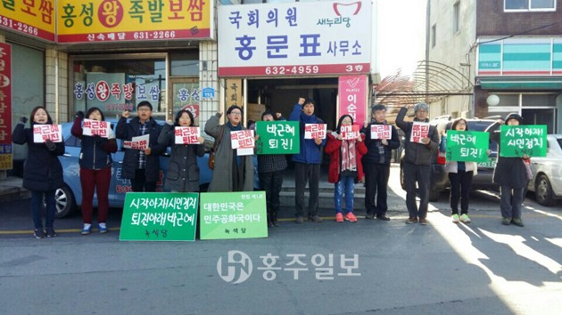 박근혜 퇴진을 명령하는 홍성·예산 군민들은 지난 2일 홍문표 의원 사무실 앞에서 기자회견을 갖고 “홍 의원은 홍성·예산 군민 앞에 사죄하고 범죄자 박근혜 퇴진에 앞장서겠다고 약속하라”고 요구했다. 이어 “홍 의원은 지금까지 새누리당 의원으로서 현 정권에 부역한 점을 솔직히 고백하고 군민들 앞에 사죄하고 박근혜 퇴진에 동참하라”며 “국민의 명령에 따르지 않는 국회의원이라면 국회의원 자격이 없고 국민 심판의 대상이 될 것”이라고 주장했다.