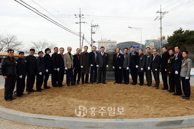 【구항】구항면 주민자치위원회(위원장 이봉영)는 지난 12일 구항면 오봉리 사거리 회전교차로에서 김석환 군수, 김덕배 군의장 및 지역주민 등 100여명이 참석한 가운데 구항면을 상징하는 ‘거북이 조형물’ 제막식을 가졌다.<사진>