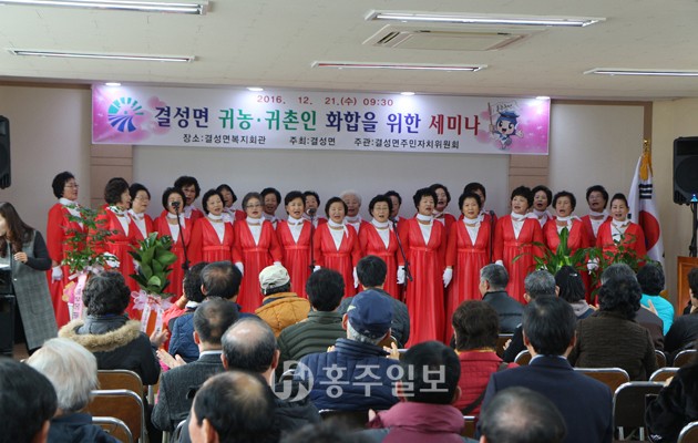 【결성】 ‘결성면 귀농·귀촌인 화합을 위한 세미나’가 지난 21일 결성면복지회관에서 개최됐다. 결성면이 주최하고 결성면주민자치위원회가 주관한 이번 행사에는 결성면민과 관계자 등 200여 명이 참석했다. 면내에 거주하는 귀농·귀촌인과 원주민의 화합과 단결을 위해 마련된 이번 행사는 주민자치센터 프로그램 농악교실의 신명나는 풍물연주로 막을 올렸다. 이어 박상식 씨의 특강과 주민자치센터 프로그램 노래교실 특별공연, 귀농·귀촌인 및 원주민 사례발표 등의 순으로 진행됐다.<사진>