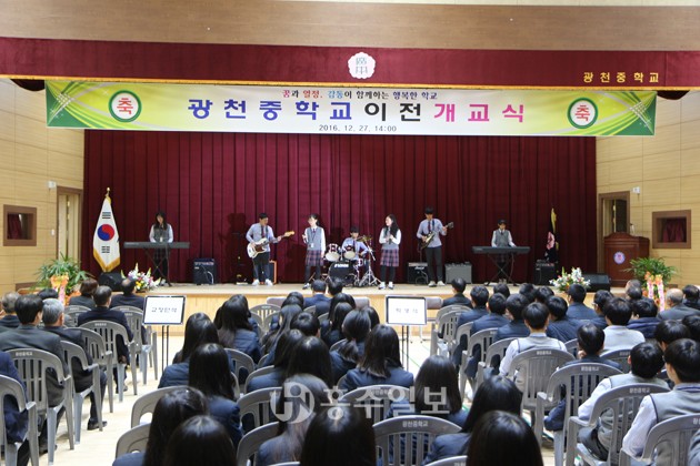 【광천】광천중학교(교장 윤여향)는 지난 27일 신축한 광천중 다목적 대강당에서 김지철 교육감을 비롯한 도내 각 기관장, 교직원, 재학생, 동창회, 학부모 등 총 250여명이 참석한 가운데 광천중학교 이전개교식을 개최했다. 광천중학교는 1946년 10월 21일 광천초급중학교로 개교해 2016년 현재까지 70년간 총 2만4418명(광천중 1만3854명, 광천여중 1만564명)의 인재들을 배출했다. 2014년 3월 1일 광천중학교와 광천여자중학교를 통합해 장기적 발전을 위해 옛 광천중 자리에 2015년 4월 15일 착공해 지난달 18일에 완공하고, 29일 신축 건물로 이전했다.