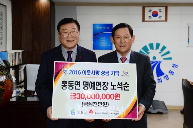 【홍동】 홍동명 노석순 명예면장이 지난 22일 군수실에서 이웃사랑성금 3000만원과 홍성사랑장학금 1000만원 등 4000만원을 전달했다. 홍동면 홍원리가 고향인 노 명예면장은 지난해에도 이웃사랑성금 4000만원과 홍성사랑장학금 2000만원 등 총 6000만원을 기탁한데 이어, 올해 역시 지역사회의 아름다운 기부문화를 확산하고자 기부 운동에 동참해 지역사회의 귀감이 되고 있다.