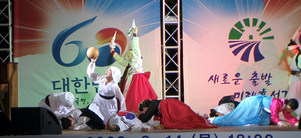 지난 14일 제63주년 광복절 및 건국 60년 경축 전야제 행사에서 보여준 홍성군립무용단(안무자 최윤희)의 힘은 대단했다.