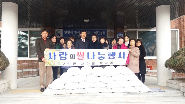 【구항】구항면 새마을부녀회(회장 성옥분)는 2017년 새해를 맞아 지난 12일 ‘사랑의 쌀 나누기 행사’를 실시했다. 사랑의 쌀 나누기 행사는 구항면 새마을부녀회 주관으로 가을에 수확한 쌀을 부녀회원들이 십시일반으로 모아 관내 어려운 가구에 전달하는 행사로, 지난 2000년부터 시작돼 17년째 매년 1월마다 연중행사로 실시하고 있다. 올해는 쌀 500kg을 모아 구항면사무소에서 열린 새마을부녀회 연시총회 후 관내 어려운 가구 25가구에게 쌀 20kg씩을 전달했다.