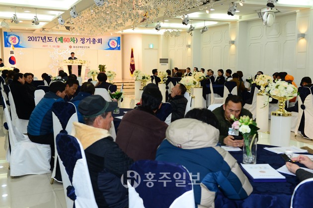 홍성군재향군인회(회장 박상돈)는 지난 23일 향군회관 웨딩홀에서 ‘2017년도 제60차 정기총회’를 개최했다.<사진> 이날 행사에서는 장학증서 수여 및 표창패, 표창장 수여가 함께 이뤄졌다. 갈산중학교 박수화 학생과 홍성중학교 김지한 학생이 장학증서와 장학금을 수여받았으며, 광천읍 재향군인회 이기풍 회장과 홍성군 재향군인회 김환태 부회장, 홍성군 재향군인회 여성회 장상예 이사가 군수 표창패를 수상했다.