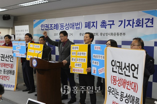 충남 기독교계가 지난달 26일 안희정 충남지사의 동성애 옹호발언에 대한 항의 성명을 내고 공식적인 사과를 촉구하고 나섰다. 충청남도기독교총연합회(대표회장 강신정)와 충청남도성시화운동본부(대표회장 최태순)는 지난달 26일 충남도청 브리핑룸에서 ‘인권조례(동성애법) 폐지 촉구 기자회견’을 열고 “안희정 지사는 본인의 정치적 입지를 강화시키고자 보편적 인권이 아닌 동성애를 인권으로 포장하고 있다”며 “자신의 정치적 야망을 위해 동성애 인권을 전면적으로 내세우는 행태를 보며 실망감을 금할 수 없다”고 주장했다.