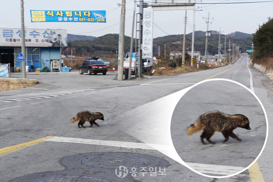 지난달 31일 서부면 신리교차로 인근에서 추운 날씨에 먹이를 찾아 내려온 너구리가 차량들 사이로 도로를 건너고 있다. 길을 건넌 이 너구리는 이내 야산으로 몸을 숨겼다.