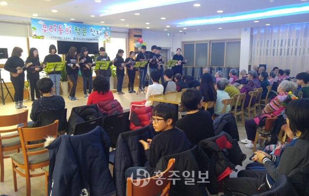 홍성군청소년수련관(관장 염운섭) 태양우주방과후아카데미는 지난 4일 사회복지법인 장수원에서 공연 재능기부를 통한 사랑나눔 봉사활동을 전개했다. 이날 봉사에서는 청소년들이 직접 준비한 모둠북 공연과 우쿨렐레 공연, 합창 등이 진행됐으며 떡을 준비해 나누는 등 어르신들과 청소년이 한 마음이 되는 시간을 가졌다.