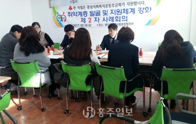 예산군지역사회보장협의체(민간위원장 김시운·실무위원장 이경효)가 2017년 지역복지 현안해결 지원사업(충남사회복지공동모금회지원)을 추진하기 위해 지난 10일 취약계층 발굴 및 지원체계 강화를 위한 사례회의를 개최했다고 밝혔다. 군에 따르면 이번 회의는 유관기관의 연계를 통한 대상자 발굴 및 확보로 서비스 중복 누락을 방지하고 서비스를 선정하기 위해 마련됐다.