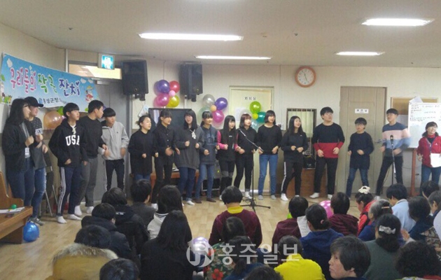 이번 공연은 군내 태양우주방과후아카데미청소년(중1,2)과 어깨동무(고1,2) 청소년이 모둠북, 우쿨렐레, 합창, 댄스 등을 준비하여 자원봉사 공연을 했다. 사회복지법인유일원에서는 4번째 공연으로 유일원 가족과 함께 합창 ‘얼굴찌푸리지말아요, 노란풍선’ 악보를 미리 준비하여 다함께 노래를 부르며 흥겨운 오전시간을 가졌다. 또한 떡을 나누며 청소년과 지역주민의 만남을 통해 함께하는 즐거움을 배우는 기회가 됐다.