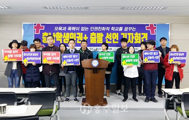 충남에서도 학생인권 조례를 제정해야 한다는 목소리가 높아지고 있다. 지난달 27일 충남도청 브리핑룸에서는 청소년노동인권네트워크, 꿈틀, 충남인권활동가 모임 부뜰, 전교조충남지부, 참교육을위한전국학부모회 충남지부 등 19개 단체가 모여 충남학생인권더하기 모임의 출범식을 겸한 기자회견을 열었다.