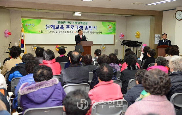 홍성군은 지난달 22일 평생학습센터에서 ‘2016학년도 초등학력인정 문해교육 프로그램 졸업식을 개최했다. <사진>