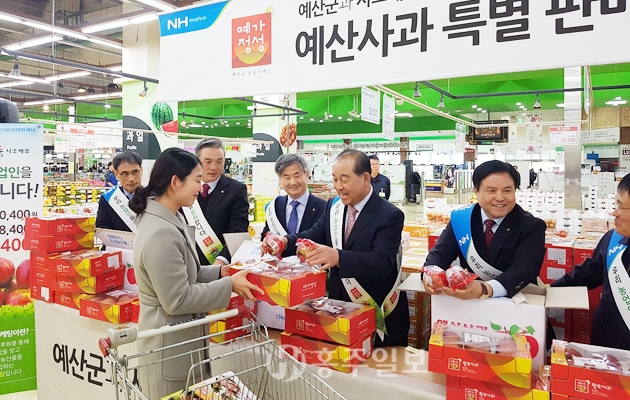 이번 행사를 통해 예산군과 나주시, 사조해표의 후원으로 행사 기간 동안 전국 농협 하나로마트에서 예가정성 황토사과(2.5kg/박스)와 알뜰배(5kg/박스)를 2000원 할인 판매한다. 황선봉 예산군수는 지난 6일 ‘체화농산물 상생마케팅 후원 기념식’ 사과 판촉행사에 참여해 행사장을 찾은 많은 고객에게 예가정성 황토사과를 널리 홍보했다.