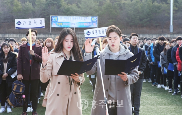 이상렬 총장의 입학허가 선언에 이어 연기예술학과 김동균 학생과 항공서비스경영학과 이윤희 학생이 신입생 공동대표로 “2017학년도 청운대학교에 입학이 허락된 1903명은 학칙을 준수하고 학업에 전념할 것”이라고 선서했다.