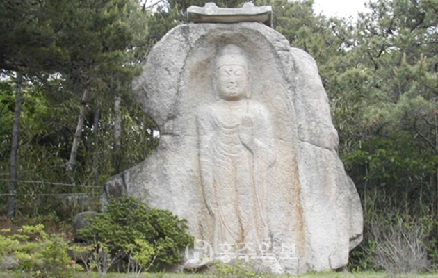 용봉사에서 북쪽 능선으로 100m쯤 올라가면 고려 초기에 만들어진 높이 4m가량의 신경리 마애여래입상(보물 제355호)이 있다. 높이 4m, 폭 1.4m 내외인 자연암석의 앞면을 파서 부조(浮彫)한 여래입상으로 얼굴은 몸에 비해 크고 풍만하다. 수인(手印)을 보면 다른 지역 불상과 달리 오른손을 쭉 펴서 다리에 붙이고 왼손은 굽혀 들었다. 불상의 상호(相好: 얼굴)는 마모가 심하지만, 높고 둥근 형태의 육계(정수리 위에 솟아나온 부분)와 소발(素髮: 머리카락이 표현되지 않는 것)의 머리카락, 미간(眉間)의 백호(白毫: 원래 흰 털을 뜻하지만, 후대에 보석 등으로 대체됨) 구멍, 반원을 그리고 있는 눈썹, 가늘게 뜬 눈, 오뚝한 코, 살짝 다문 입, 어깨까지 닿아 있는 긴 귀를 지니고 있다는 것을 알 수 있다. 목 부분도 마모가 심하여 삼도(三道: 세 개의 선)의 표현이 선명하진 않다.